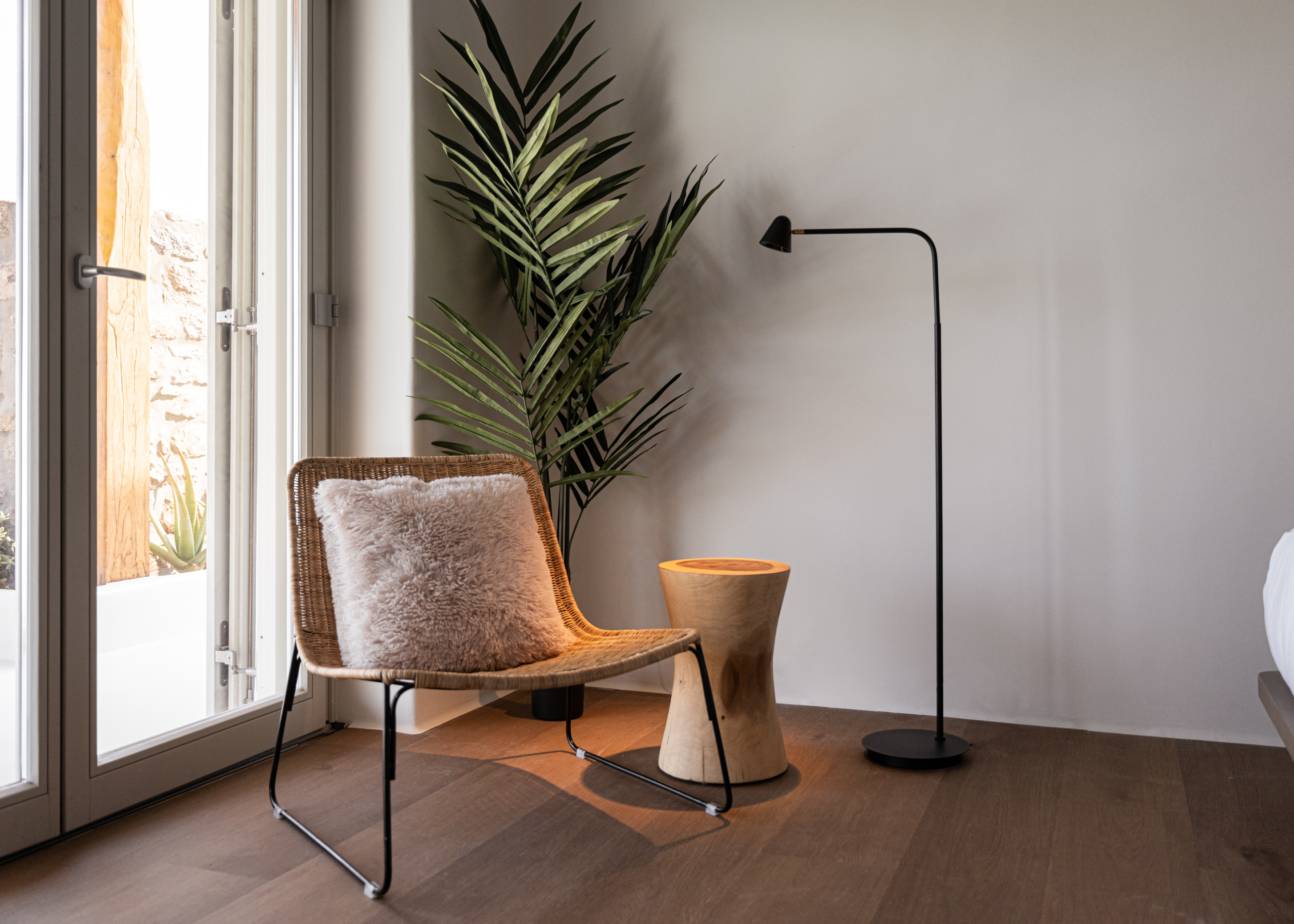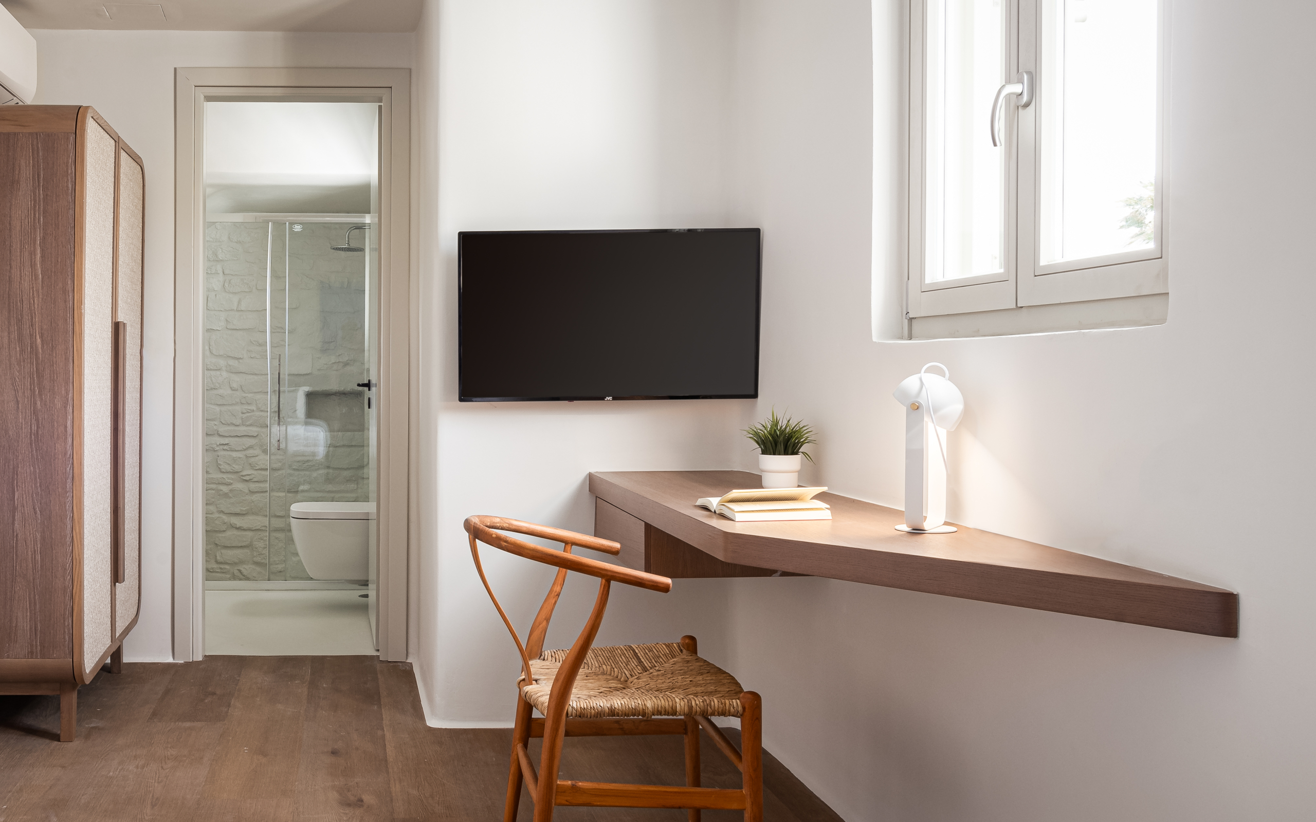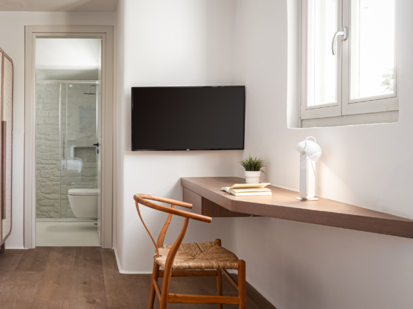 Room 1: double bed, TV, [A/C], safebox, direct access to the pool area via balcony doors, well-designed en-suite bathroom with shower and double sink | sea view room