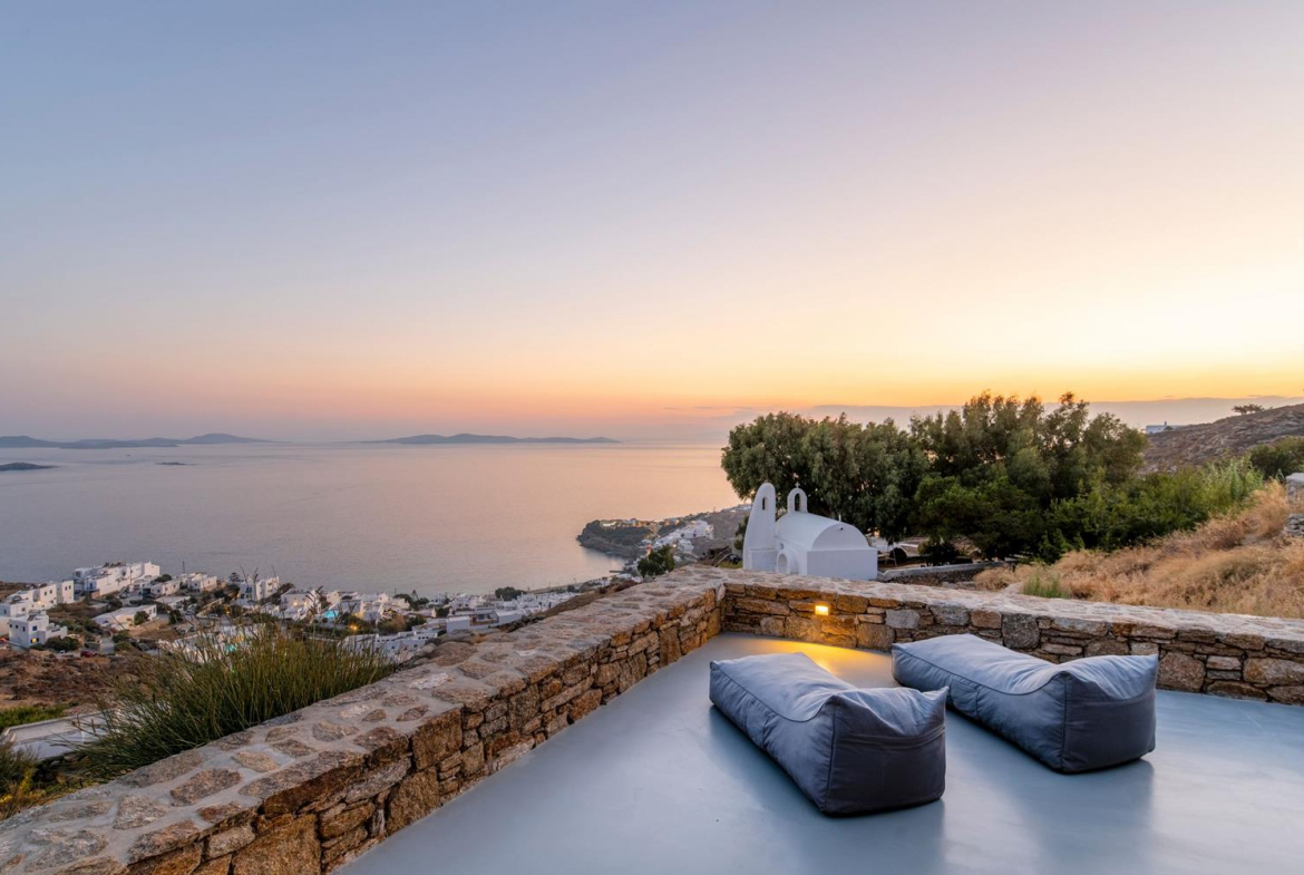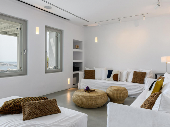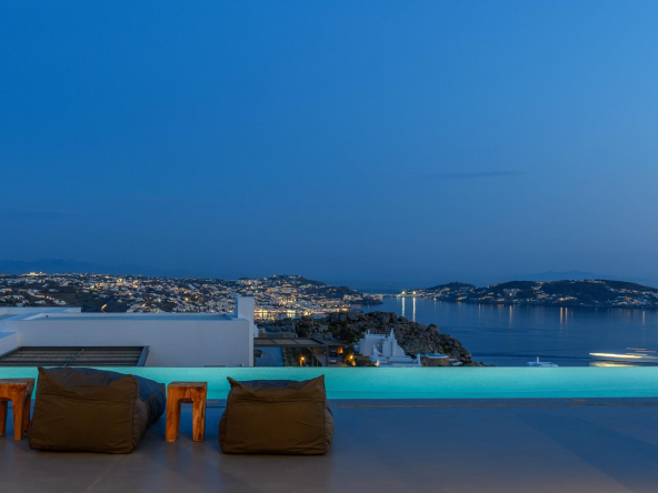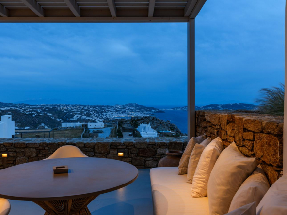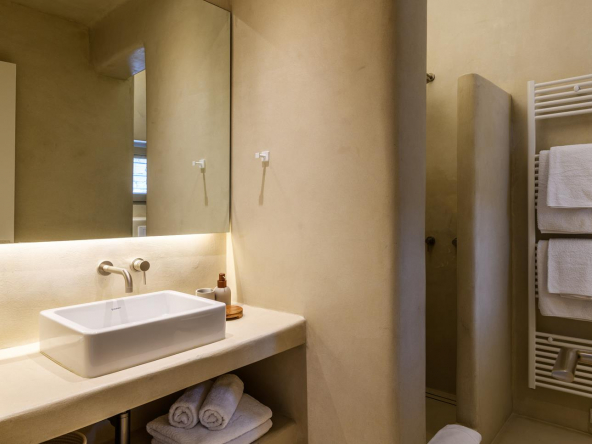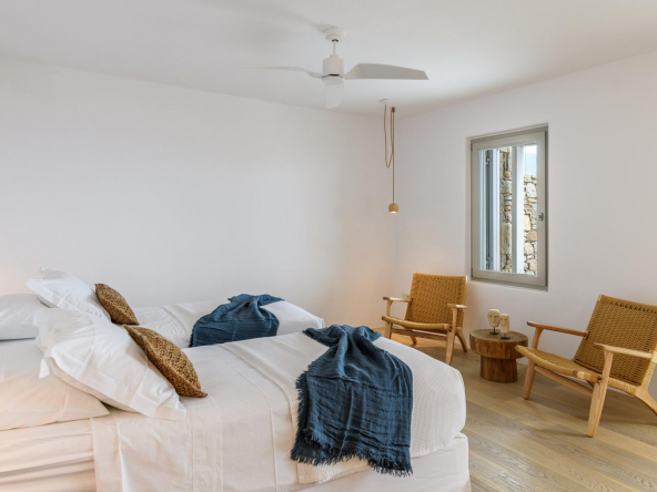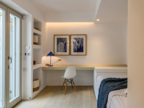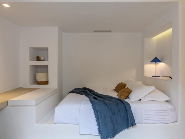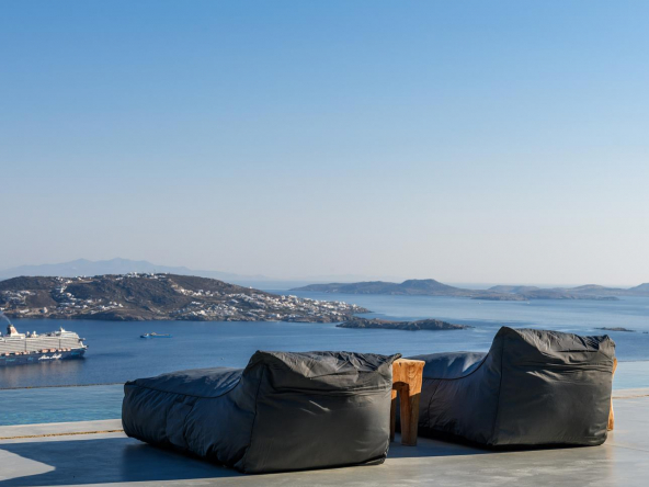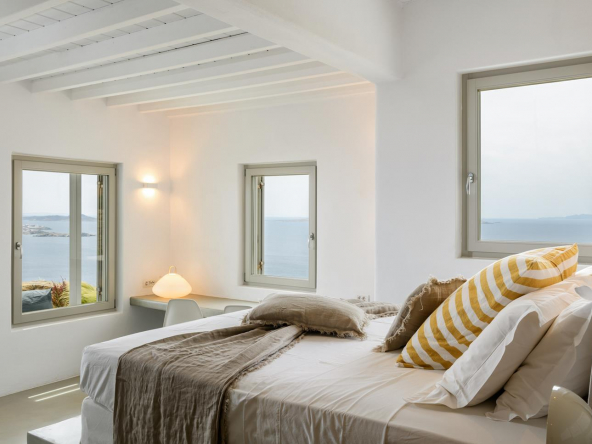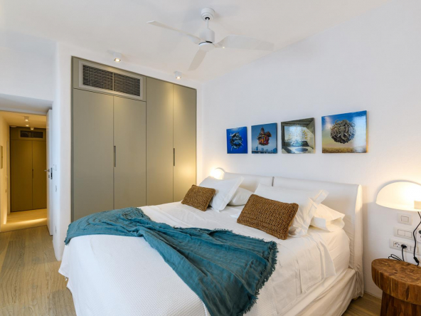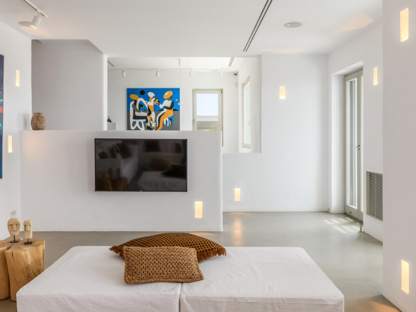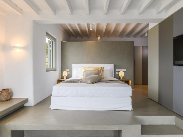 Room 1: master bedroom with queen-size bed, TV, Safebox, closet, amazing sea & town view through a large window, spacious open plan en-suite bathroom with raining shower – access to the outdoor area and built-in lounge area under a pergola, via balcony doors