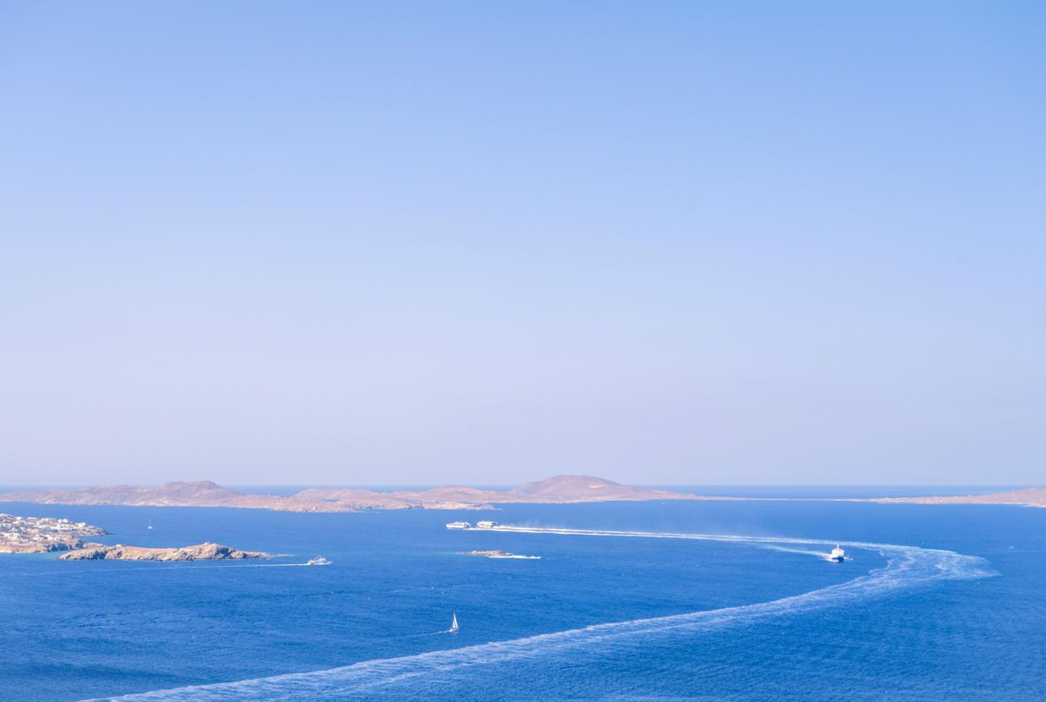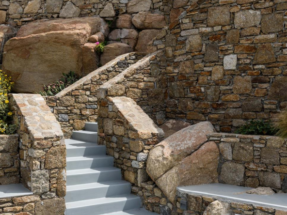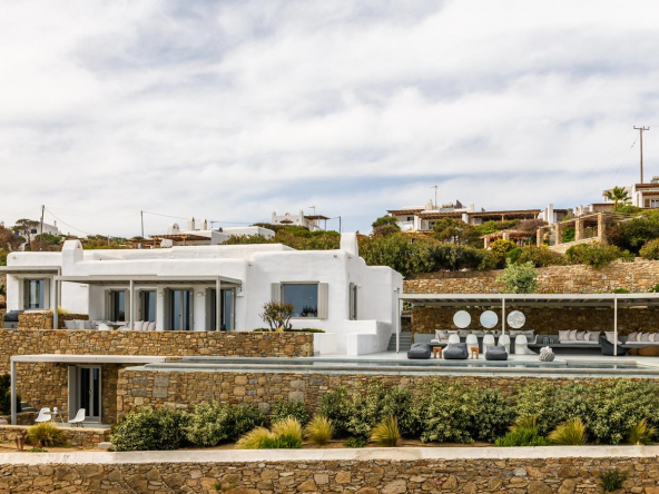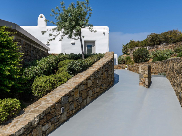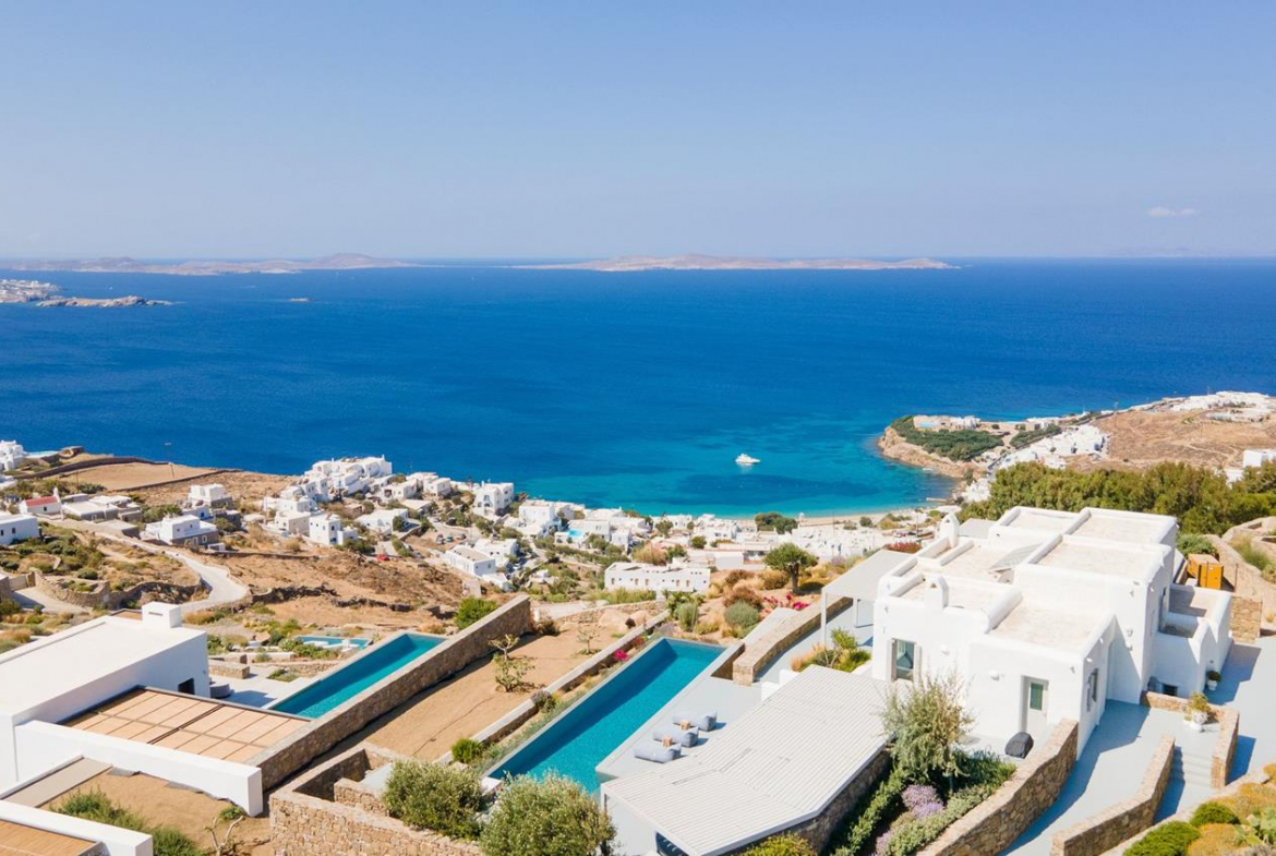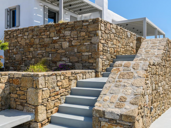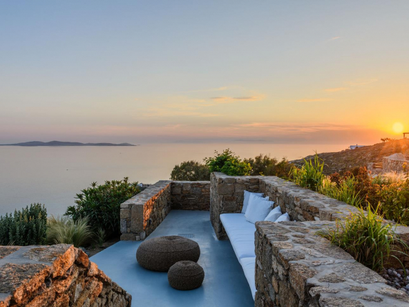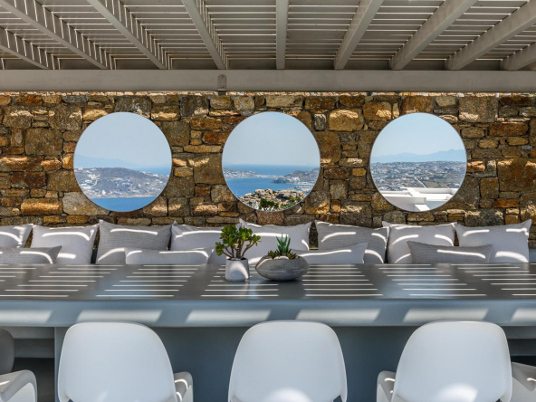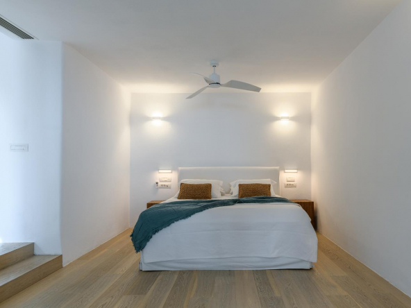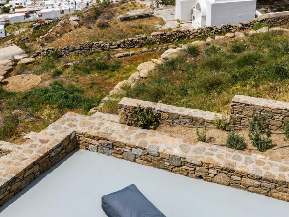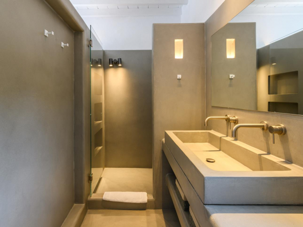 Room 1: master bedroom with queen-size bed, TV, Safebox, closet, amazing sea & town view through a large window, spacious open plan en-suite bathroom with raining shower – access to the outdoor area and built-in lounge area under a pergola, via balcony doors
