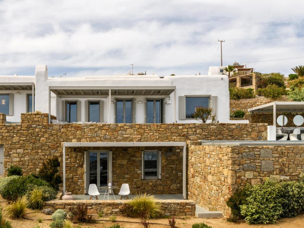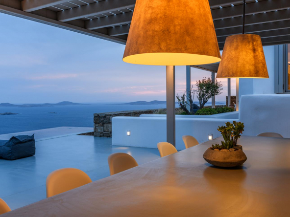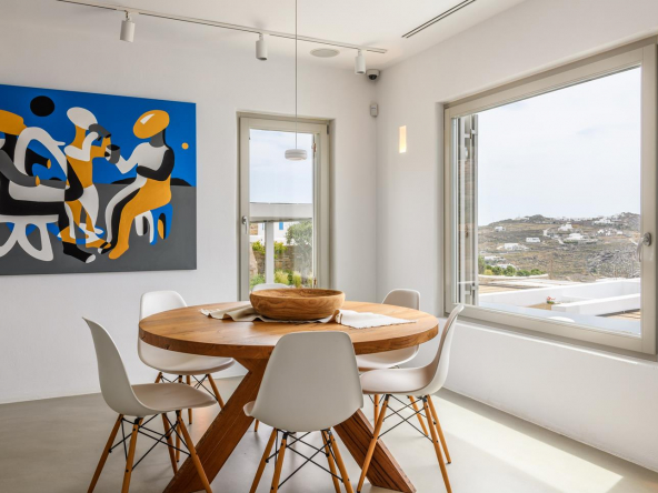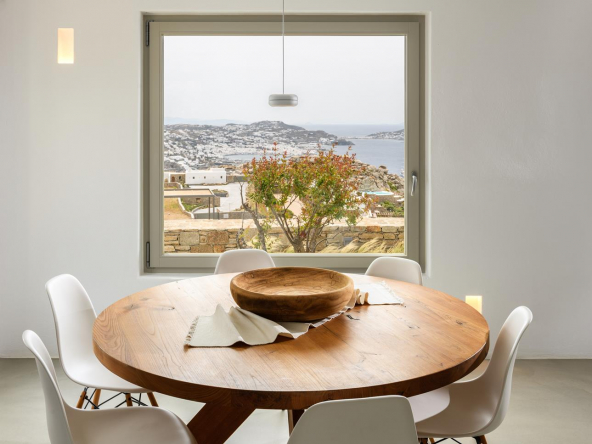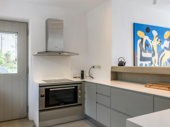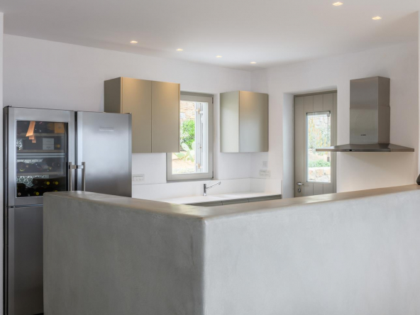 Open plan fully equipped kitchen – direct access to the BBQ and outdoor area, indoor dining area (6 seats), living room with Tv, and sea view. Some stairs lead to the guest WC.