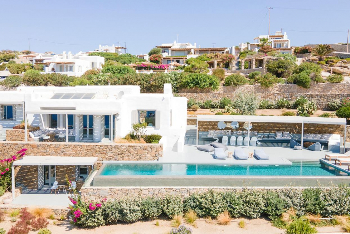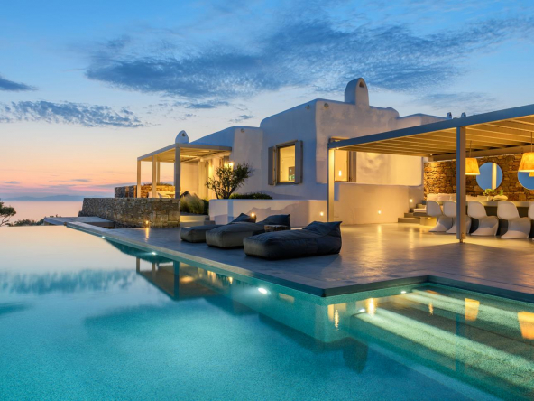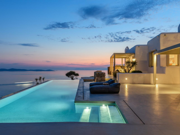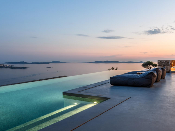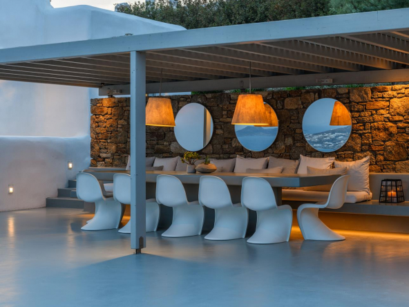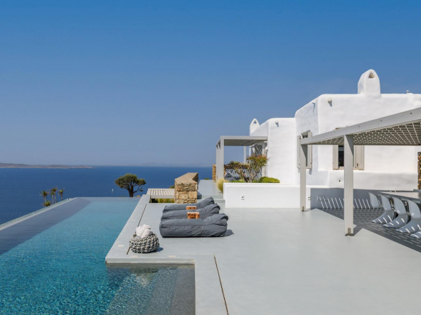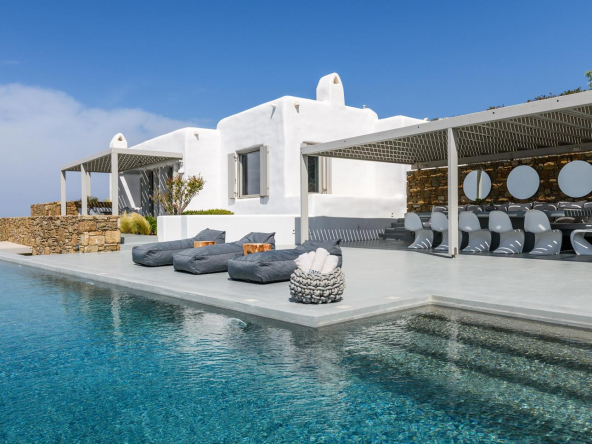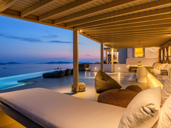 Infinity pool (15m x 3.5m), loungers, built-in outdoor dining area (12 seats), and built-in lounge area under the pergola, several lounge areas, a huge yard, and a parking area.